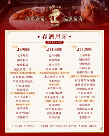 全台第一間一鴨八吃的烤鴨專賣店。 除了北平烤鴨,亦提供多樣經典美味的北方名菜與純手工製作的麵食。