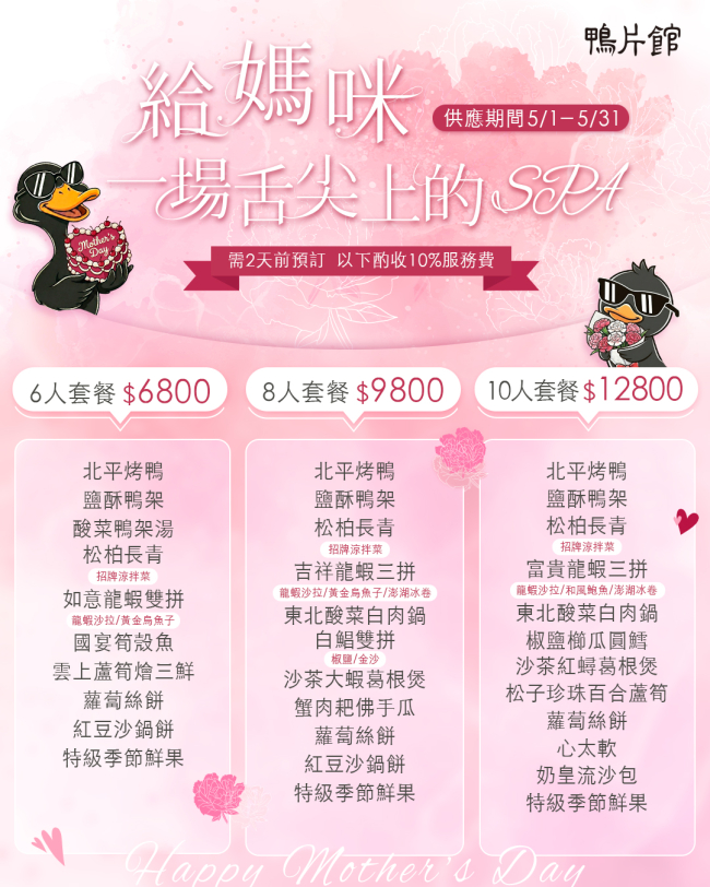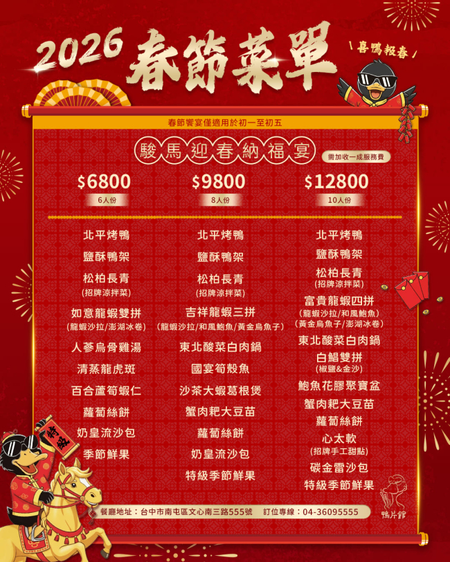 片皮烤鴨、醬爆鴨架、鹽酥鴨架、三杯鴨架、酸菜鴨架湯、銀芽炒鴨肉絲、生菜鴨鬆